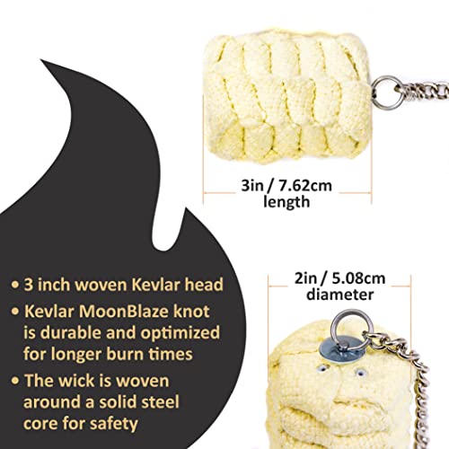 Our original design and now the industry standard, our Moonblaze head is the perfect combination of functional, durable, and customizable. The heads are made with flat-wick kevlar, woven by hand into our custom MoonBlaze cylindrical braid with a solid metal core for durability. The elongated kevlar knot provides excellent balance and control, while absorbing the ideal fuel ratio for longer, brighter burns, lasting 4-7 minutes in dry environments.